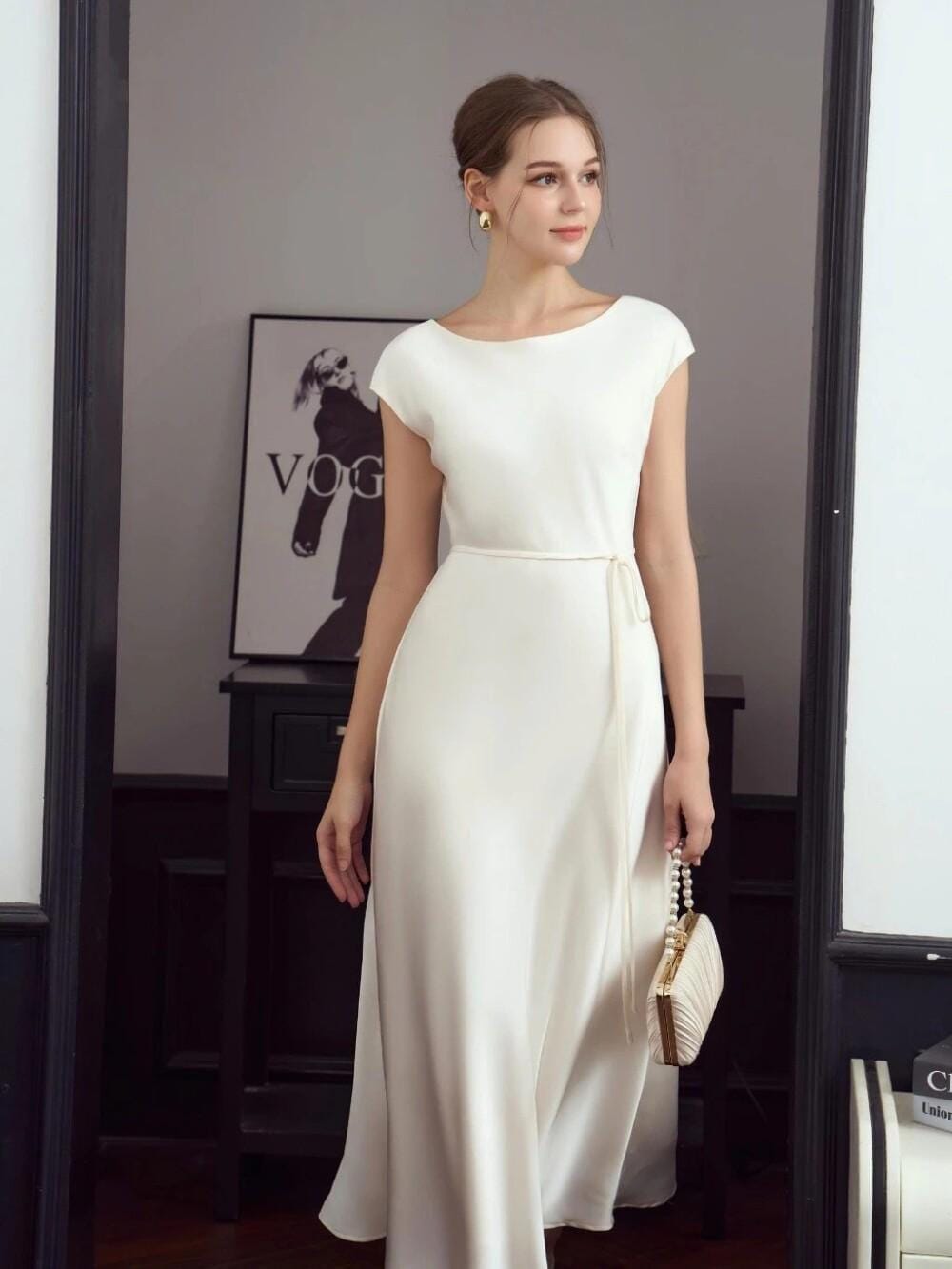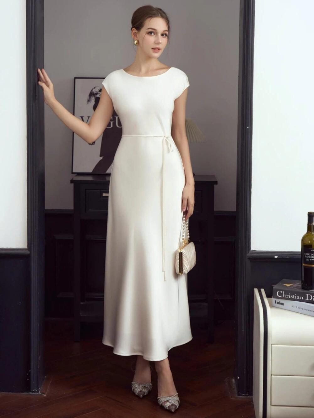 Our silk dress drapes in a flattering A-line cut, brushing the waist and flaring softly. Choose your favorite neckline (Round, V, Square, Boat) and sleeves (from sleeveless to long straight). Satin-lined pockets are discreetly hidden at the hips. Length falls mid-calf or ankle.